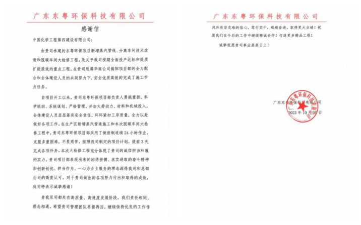 近日,華南公司收到廣東東粵環(huán)保科技有限公司發(fā)來(lái)感謝信,對(duì)項(xiàng)目部提前3天完成新增蒸汽管線、分離車(chē)間技術(shù)改造和脫碳車(chē)間大檢修工程表示誠(chéng)摯感謝。